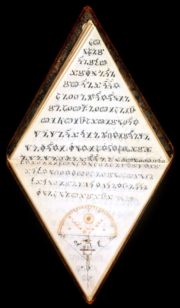 MS 209 – Getty Research Institute (Manly P. Hall Collection), triangular codex with colored figures.